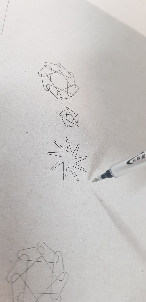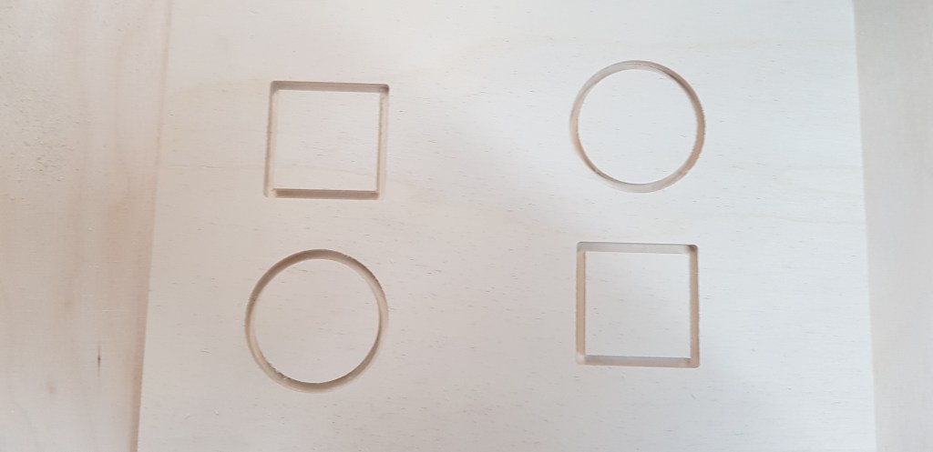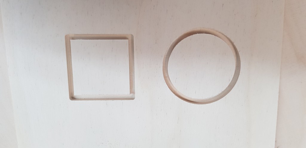 Die ersten Fräsergebnisse sind sehr zu meiner Freude gelungen. Ich hatte zuerst einen Stift eingespannt, um mal ein Gefühl für die Maschine zu bekommen, dann nach der ersten Zuversicht habe ich mich getraut um einen Fräser einzuspannen. Zum Test habe ich dann mal Mehrecke und Kreise versucht.
