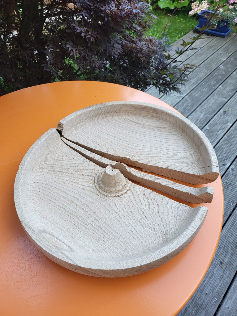 Das wäre doch glatt eine grosse Schale aus Eiche geworden, leider ist sie zweimal gebrochen. Meistens sind die Spannungen im Holz nicht von aussen zu erkennen. Es knackt dann und schon ist es zu spät.