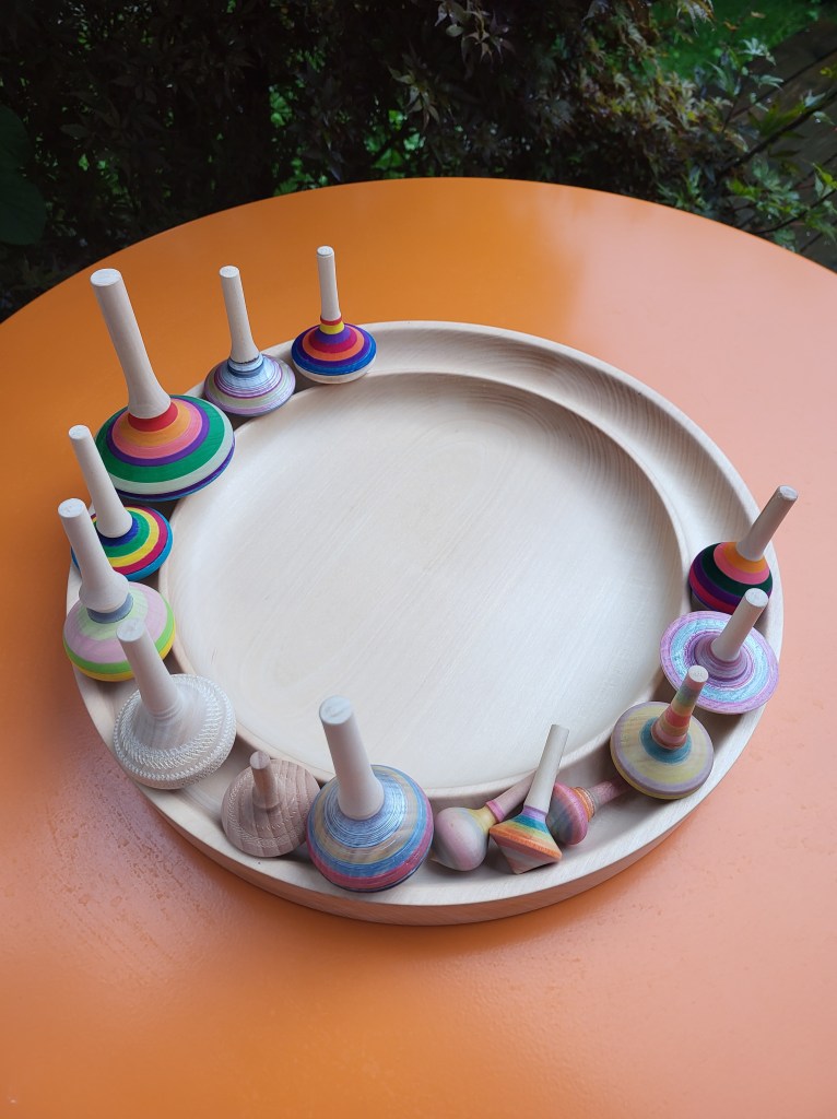 Der neue Teller zum Parken und drehen der Kreisel. Viele unterschiedlich bunten Kreisel sind in den letzten Wochen neu entstanden. Habe mit verschieden Farben und Techniken gespielt und es sind sehr interessante Farbkombinationen entstanden.