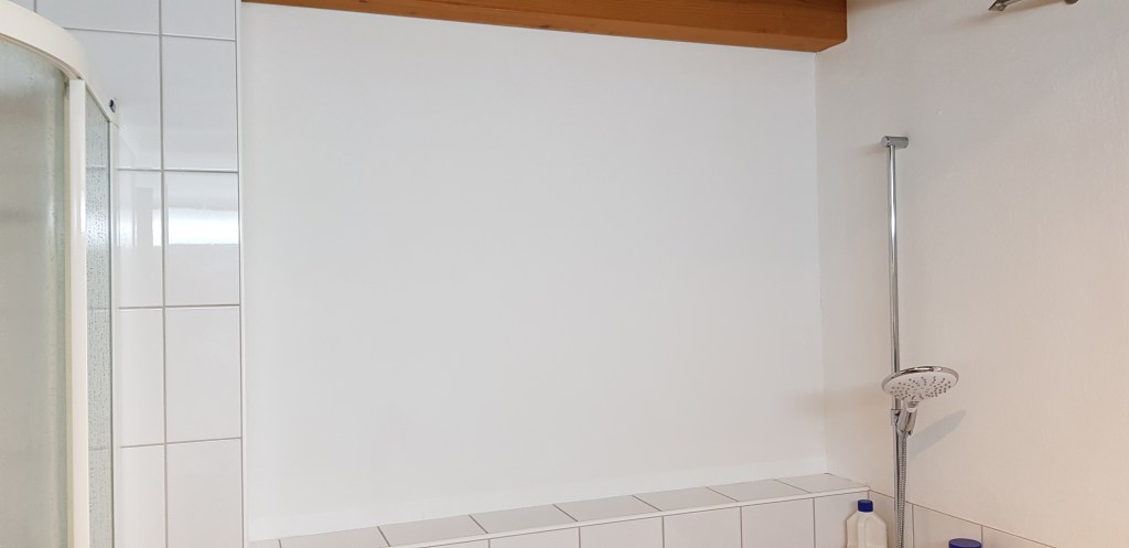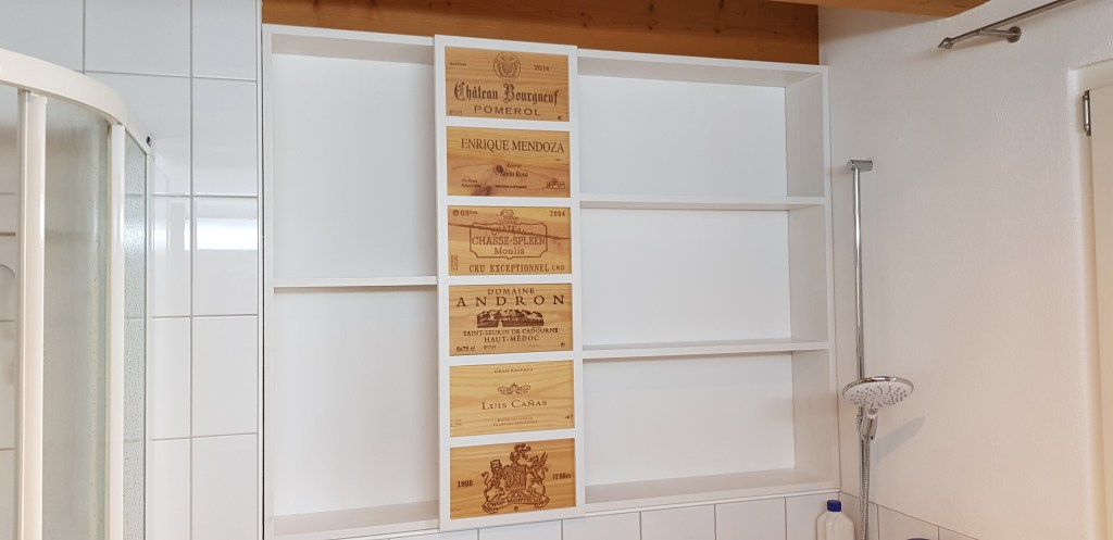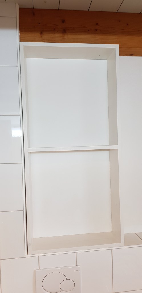 Wir hatten ein grosse weisse Wandfläche im Bad, die mich schon länger störte. Ein wenig Stauraum sollte auch sein, und am besten noch versteckt. Habe dann 2 Regale gebaut die passgenau die Wand ausfüllen. Die Blende hängt an der Verbindungsstelle der beiden Regale und verdeckt links wie auch rechts den gewonnen Stauraum. So lassen sich Reinigungsmittel oder Toilettenpapier nett verstecken.