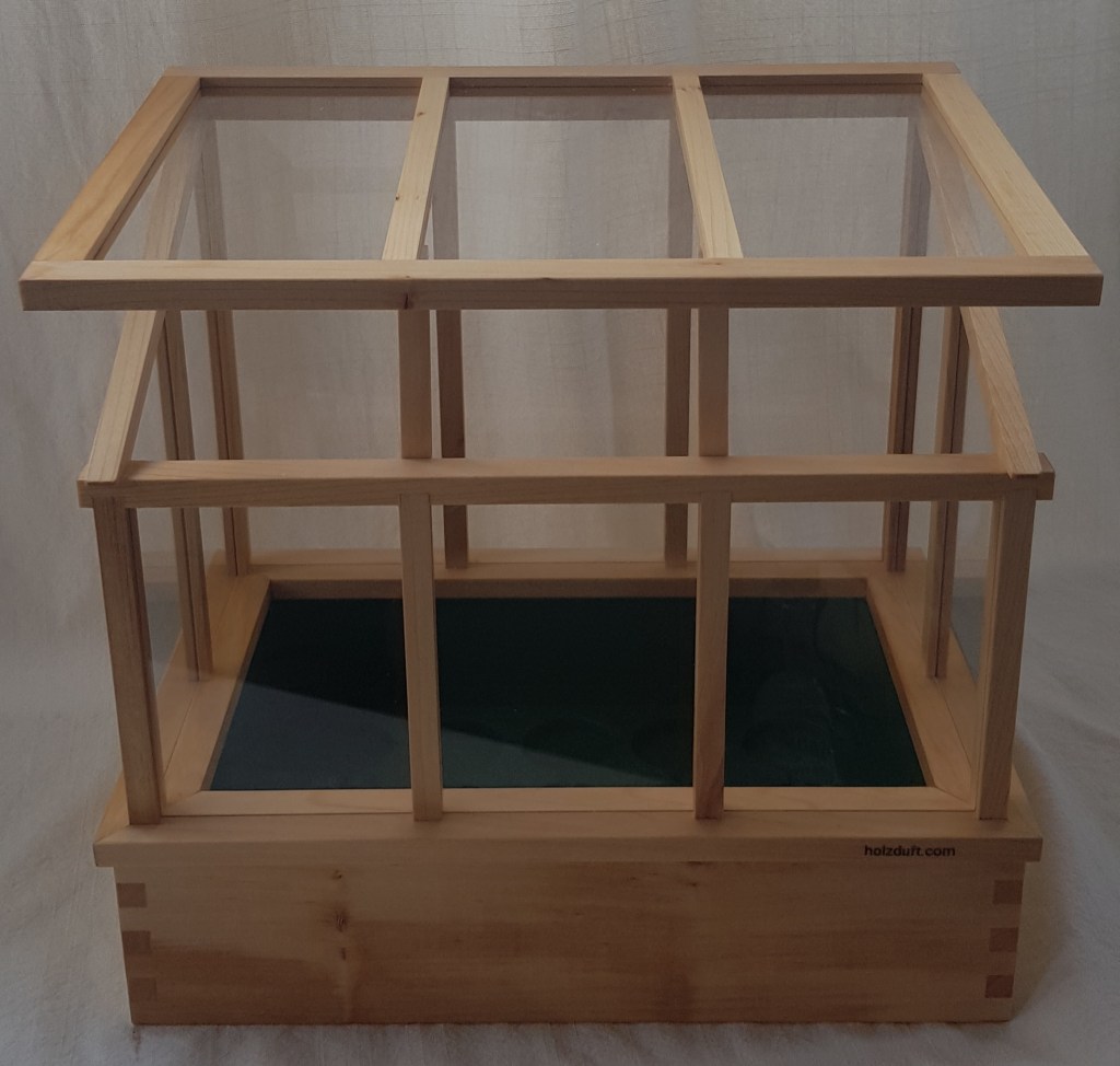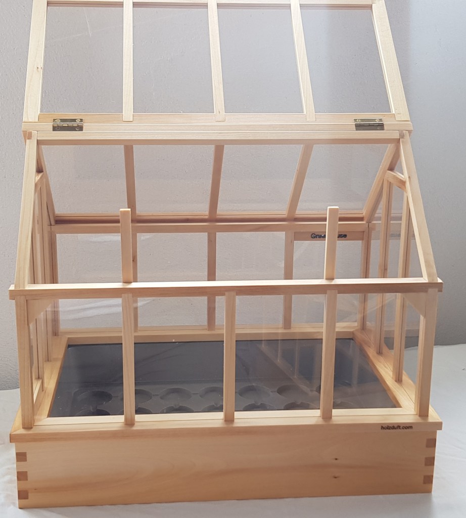 Verschiedene Mini Gewächshäuser aus heimischer Linde gefertigt. Mit Anzuchtschale aus Kunststoff zur Bepflanzung von Jungpflanzen, Kakteen oder Sukkulenten geeignet. Die Dachflächen lassen sich öffnen und können per integrierte Lüftungsstäbe dauerhaft in dieser Position belassen werden. Um besser an die Bepflanzung zu gelangen, lassen sich die Oberteile komplett von der Unterschale abheben. Die Pflanzschale wurde in einen schönen Holzkasten verstaut, die Fingerzinken sind klassisch ausgeführt und verleihen dem Gewöächshaus zusätzlich Charakter. Bis auf die Montage der Scharniere ist das Gewächshaus komplett ohne Schrauben gefertigt.