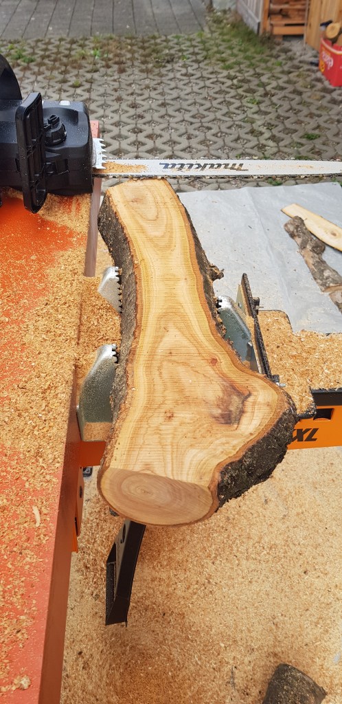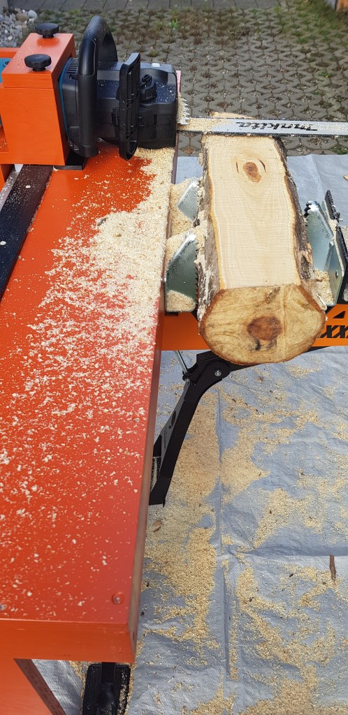 Das Ganze hat natürlich seine Limitationen, denn irgendwann ist zu wenig Stamm übrig um ihn ordentlich zu spannen, trotzdem lassen sich auf diese Weise, doch ordentliche Bretter schneiden. Die Kettensäge macht keinen feinen Schnitt, wie eine Bändsäge und auch der Verschnitt durch die dicke Kette ist grösser, trotzdem hat sich die Schneideeinheit bisher gut bewährt.
