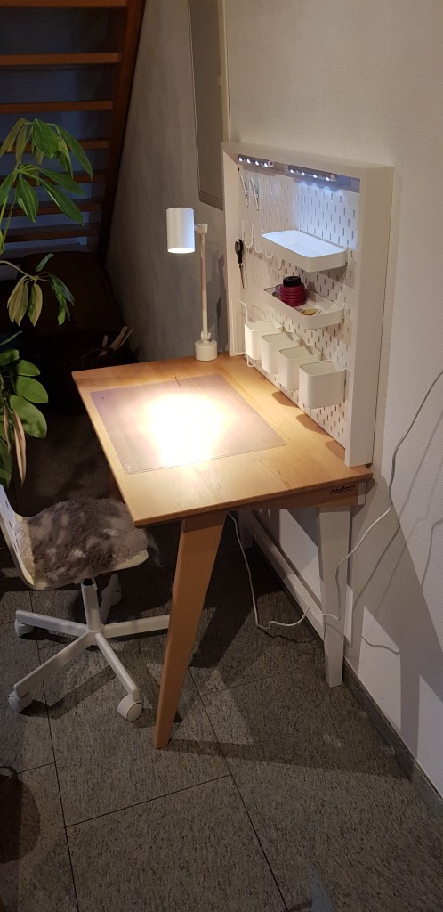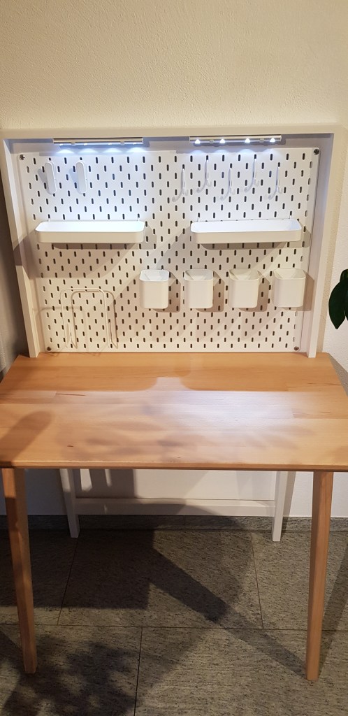 Auch hier handelt es sich um ein nachhaltiges Möbel, dass aus alten Treppenstufen und Paletten Holz besteht. Die Treppenstufen sind bei einer Hausrenovierung angefallen und waren um die 80 cm lang. Diese wurden aufgetrennt, gehobelt und neu verleimt, sowohl auf Länge, wie auch Breite. Das hat mich dann einen Satz Hobelmesser und ein Kreissägeblatt gekostet, weil ich nicht mit der Härte des aufgebrachten PU-Lacks gerechnet habe. Nun schlauer, mussten die restlichen Treppenstufen mit Heissluft und Spachtel abgekratzt werden. Hat dann alles doch noch geklappt und die alten Treppenstufen dienen jetzt als Schreibtischplatte. Die Lochwand gibt’s beim schwedischen Möbelhaus und verleiht dem Schreibtisch zusätzlichen Stauraum.