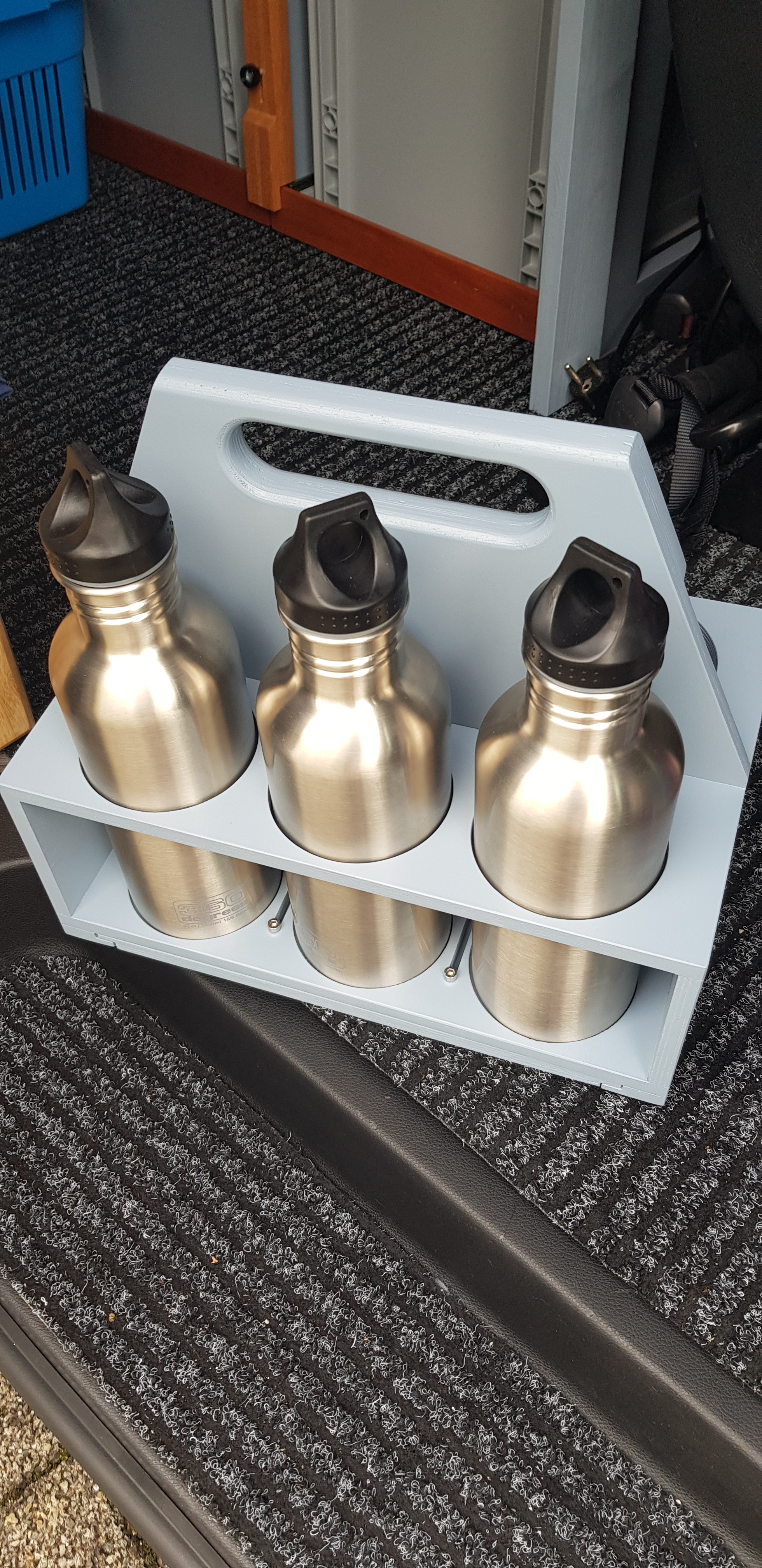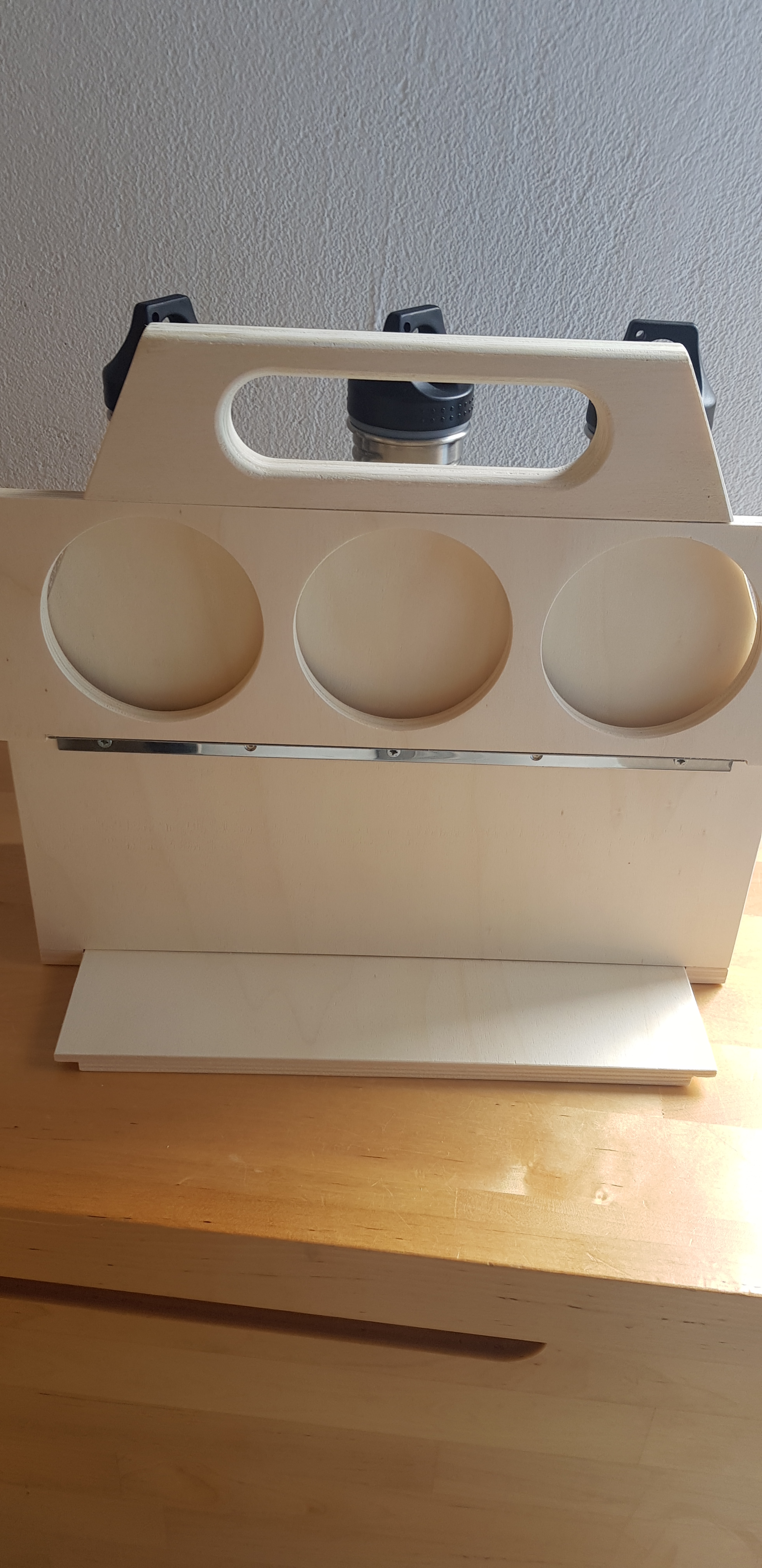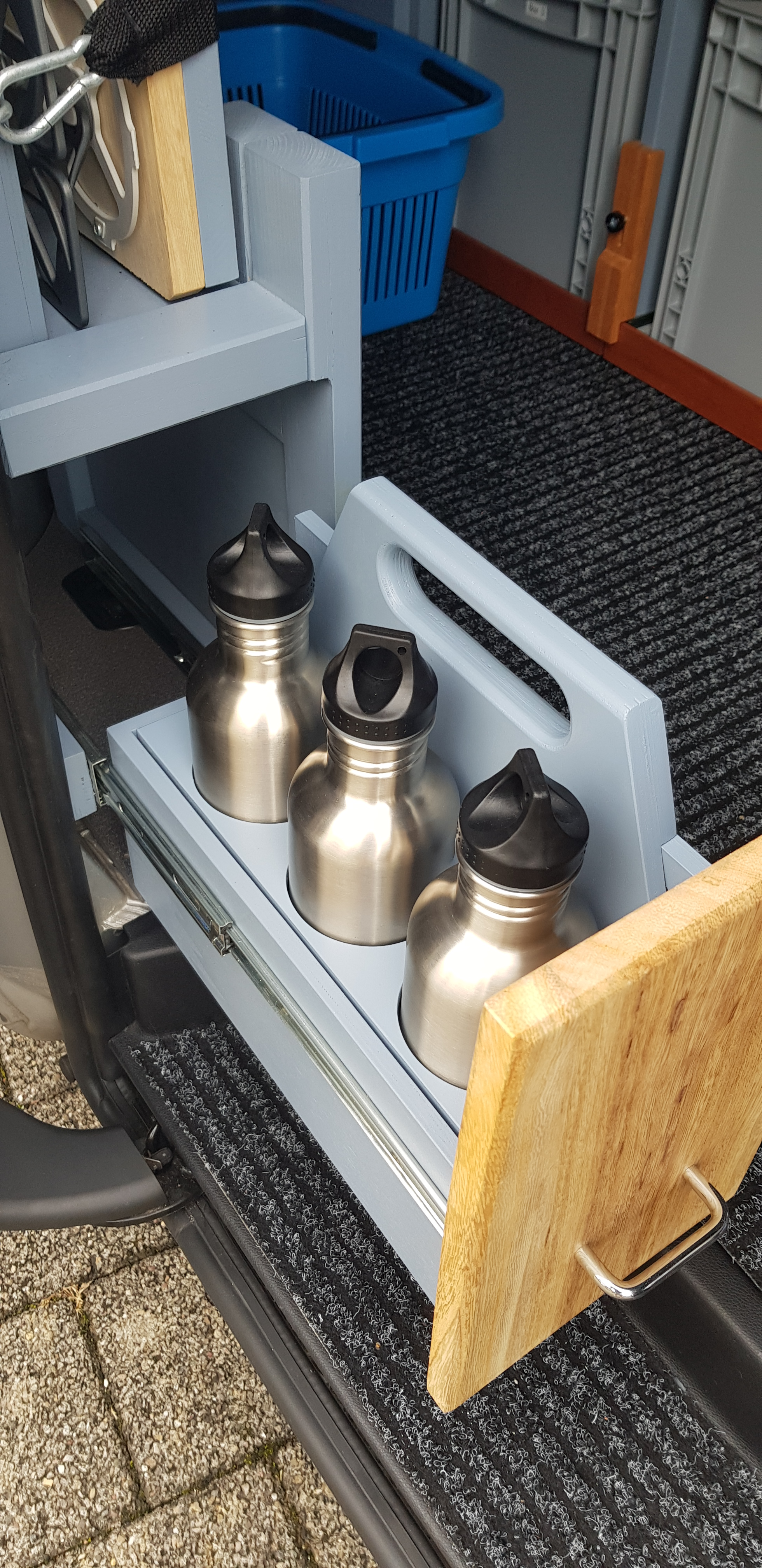 Die Lösung im vorhandenen Stauraum kommt eine 6-Päck Tragerl und hilft mir beim Wasser auffüllen. Da der Stauraum für alle 6 Flaschen zu klein ist, können dort nur 3 dauerhaft gelagert werden, aber zum Füllen lässt sich der Boden ausziehen und die obere Klappe absenken, um 6 Flaschen mit einem Griff zu tragen.
