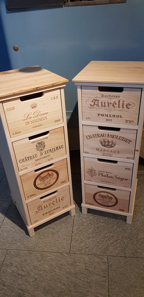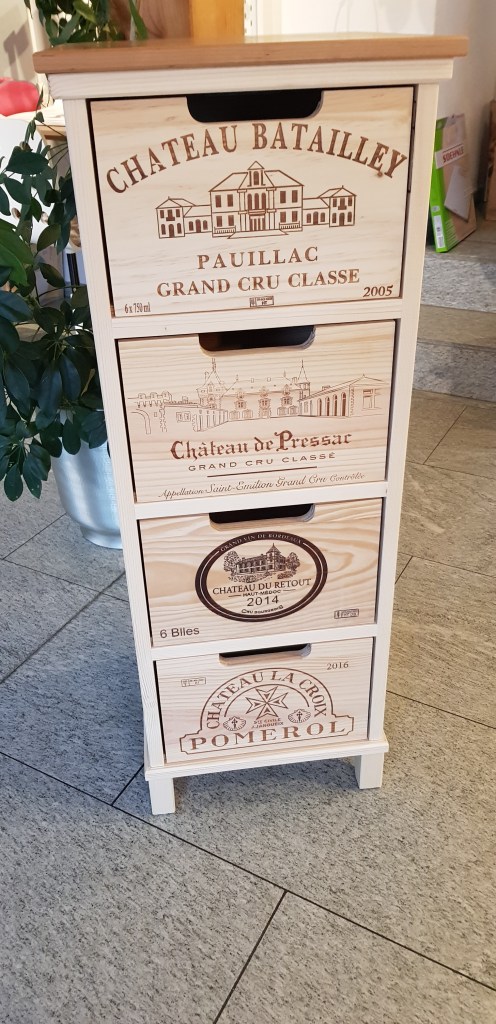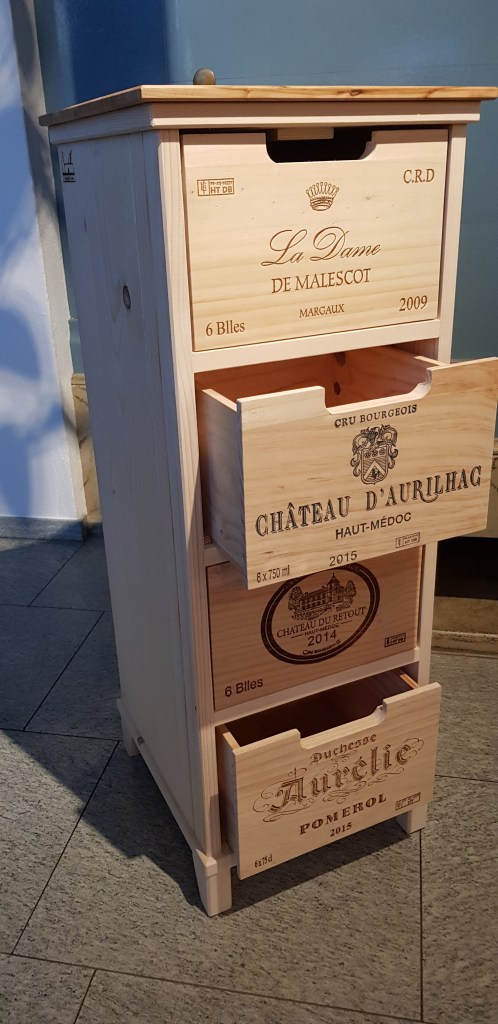 Wieder gab es zu Weihnachten erstens Zeit und die Idee, was Selbstgebautes soll unter den Christbaum. Wir haben dann übers Jahr verfolgt was denn so auf der Wunschliste unserer Liebsten steht. Stauraum sollte es sein, für kleine Dinge und natürlich Nachhaltig. Daraus sind diese Weinkistenkommoden entstanden. Der Korpus wurde aus Paletten Holz gebaut und die Schubladen sind alte überarbeitete Weinkisten. Überarbeitet deswegen, da die Längsseite der Kisten die Seitenwangen darstellen sollten, aber dort waren dann die schön gebrannten Logos. Also habe ich Kisten zerlegt mit leeren Seiten wieder zusammengenagelt und die Fronten nach vorne auf die kurzen Seiten geklebt.
